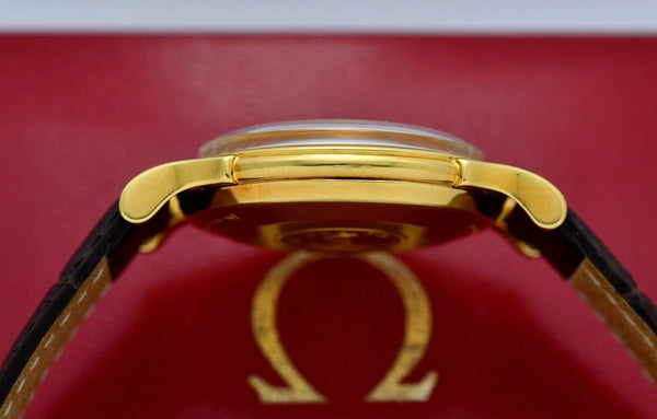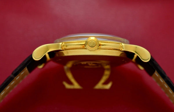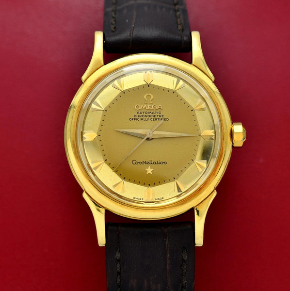 Montre oméga Constellation Chronomètre Deluxe de 1956 cadran « Pie Pan » d'origine en très bon état, finition miroir avec index « Dents de requin » boîtier en or massif 18 carats avec fond clipsé calibre 501, 19 rubis, automatique, chronomètre en parfait état de fonctionnement, à l'heure exacte ; couronne d'origine signée. Montre avec bracelet en cuir véritable Hirsch neuf avec boucle déployant d'origine signée.